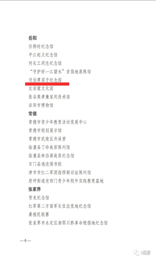 为深入贯彻落实党的二十大精神,深学笃行落实习近平总书记关于少年儿童和少先队工作的重要论述,建立校内外互为补充、有机联动的少先队实践教育体系,进一步推动新时代全省少先队社会化发展,经单位自主申报、市州审核推荐、省级综合评定,团省委、省少工委决定命名毛泽东同志纪念馆等100家单位为首批湖南省少先队校外实践教育营地(基地)。其中,我区河伯潭屈子纪念园入选。