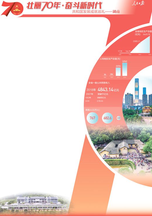70年,在人类历史的长河中不过是短暂的瞬间,新中国却走过了其他国家几百年的发展历程,演绎了一场波澜壮阔的巨大变迁。中华民族迎来了从站起来、富起来到强起来的伟大飞跃。伴随着新中国铿锵前进的步伐,在党中央坚强领导下,湖南取得了令人瞩目的辉煌成就,全省地区生产总值从1949年的17.7亿元跃升到2018年的3.64万亿元,人均地区生产总值从不到100元增加到5.29万元,实现了从百废待兴到百业兴旺、从内陆封闭到创新开放、从绝对贫困到全面小康的历史跨越。特别是党的十八大以来,全省各族人民坚持以习近平新时代中国特色社会主义思想为指导,深入贯彻习近平总书记对湖南作出的“精准扶贫”“一带一部”“三个着力”“守护好一江碧水”等重要指示精神,扎实推动党中央各项决策部署落地生根,加快建设富饶美丽幸福新湖南,各项事业发展取得历史性成就、发生历史性变革。