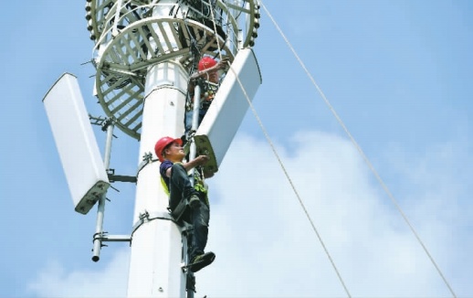 8月9日,长沙市岳麓区靳江路湖南移动5G基站建设现场,施工人员顶着烈日,爬上30余米高的信号塔安装5G设备。今年4月以来,中国移动通信集团湖南有限公司加快推进长沙地区的5G基站建设。目前,长沙的移动5G基站已建设开通300个。(记者 田超 通讯员 肖志凌 摄影报道)