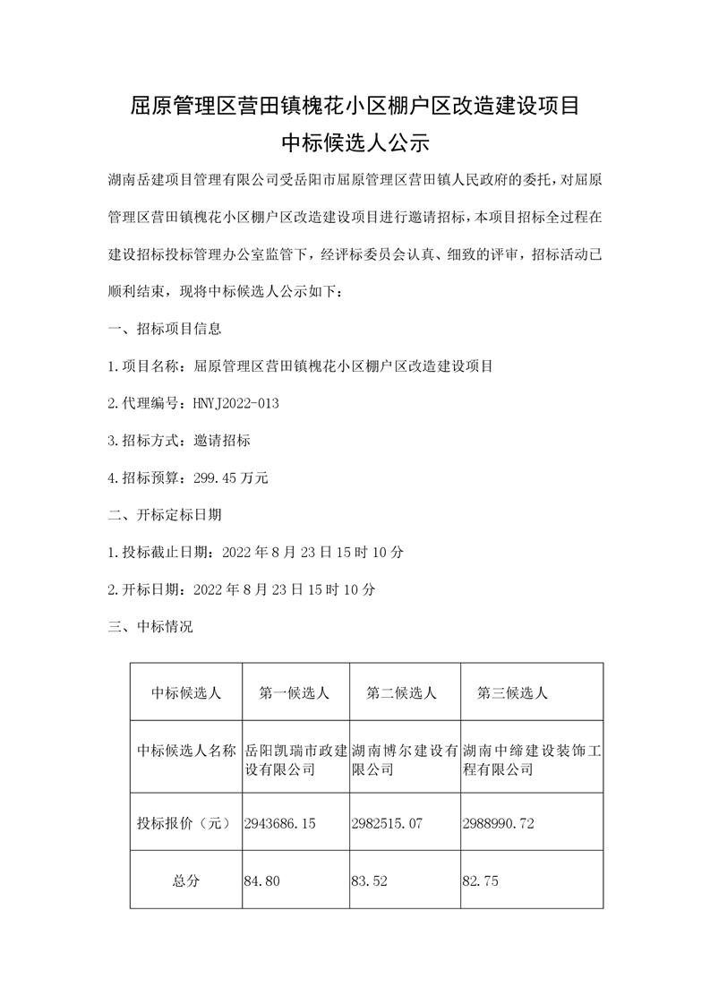 屈原管理区营田镇槐花小区棚户区改造建设项目 中标候选人公示