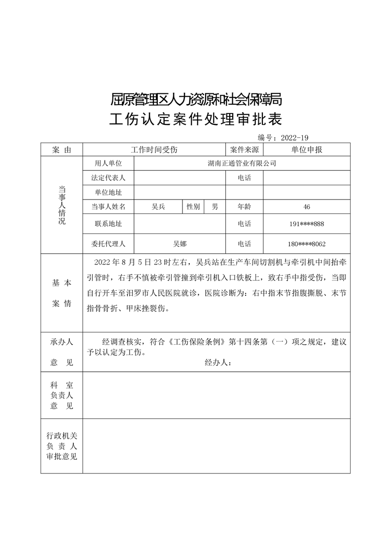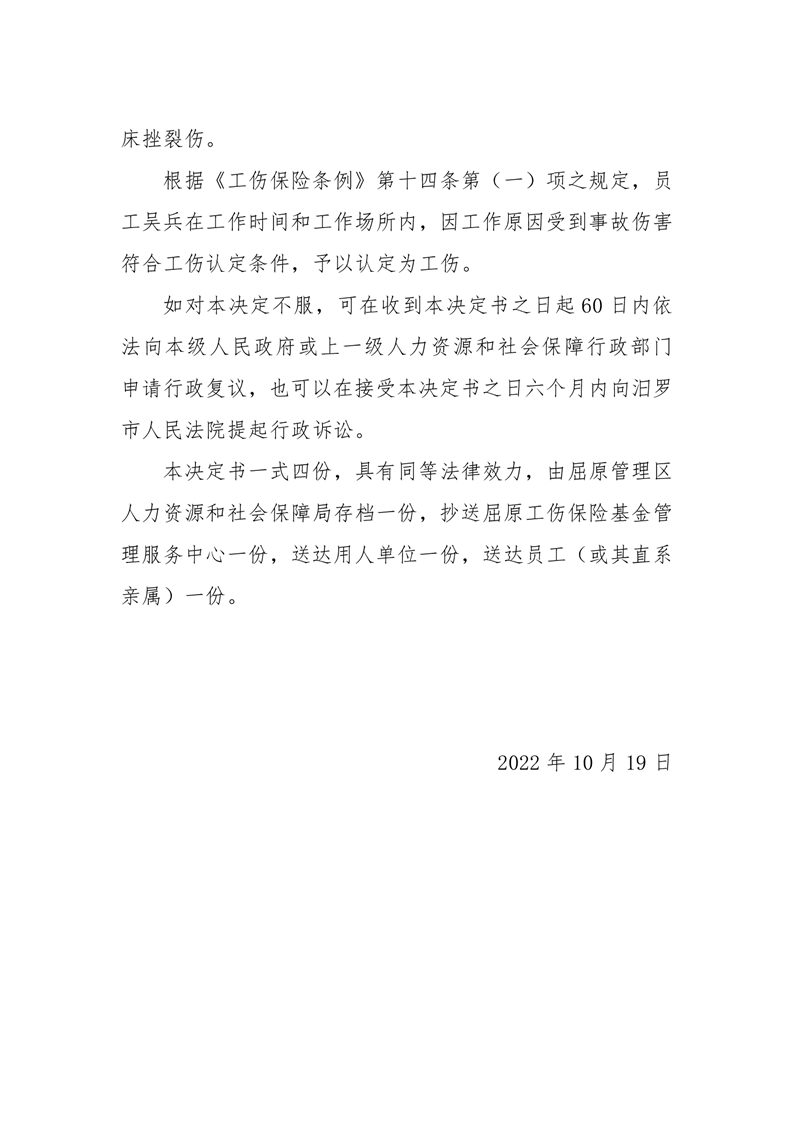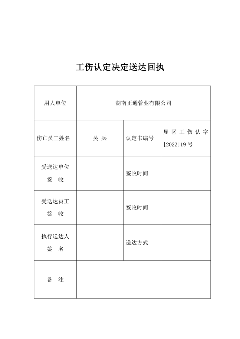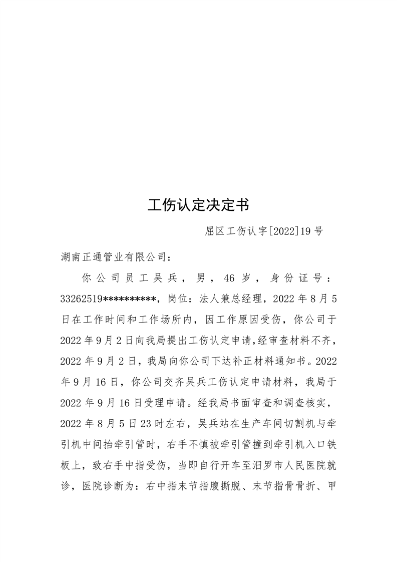 2022年湖南正通管业有限公司吴兵工伤认定决定书