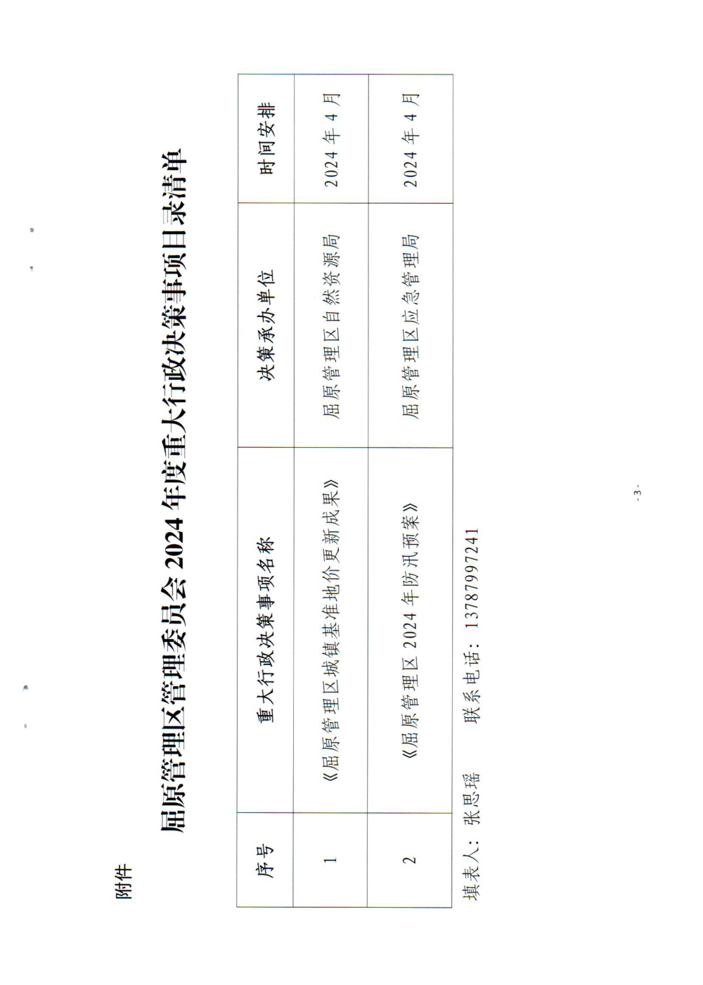 关于公布2024年度屈原管理区管理委员会重大行政决策事项目录的通知