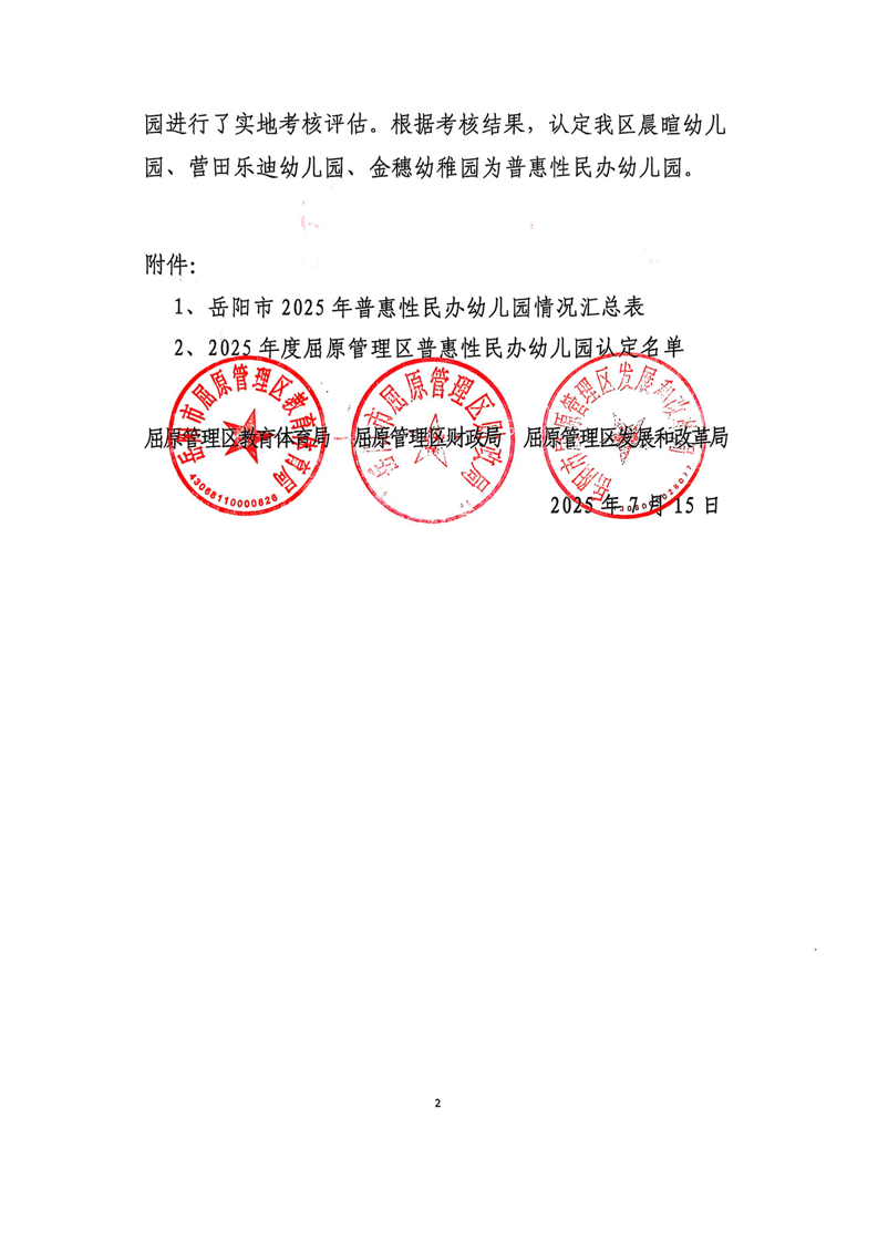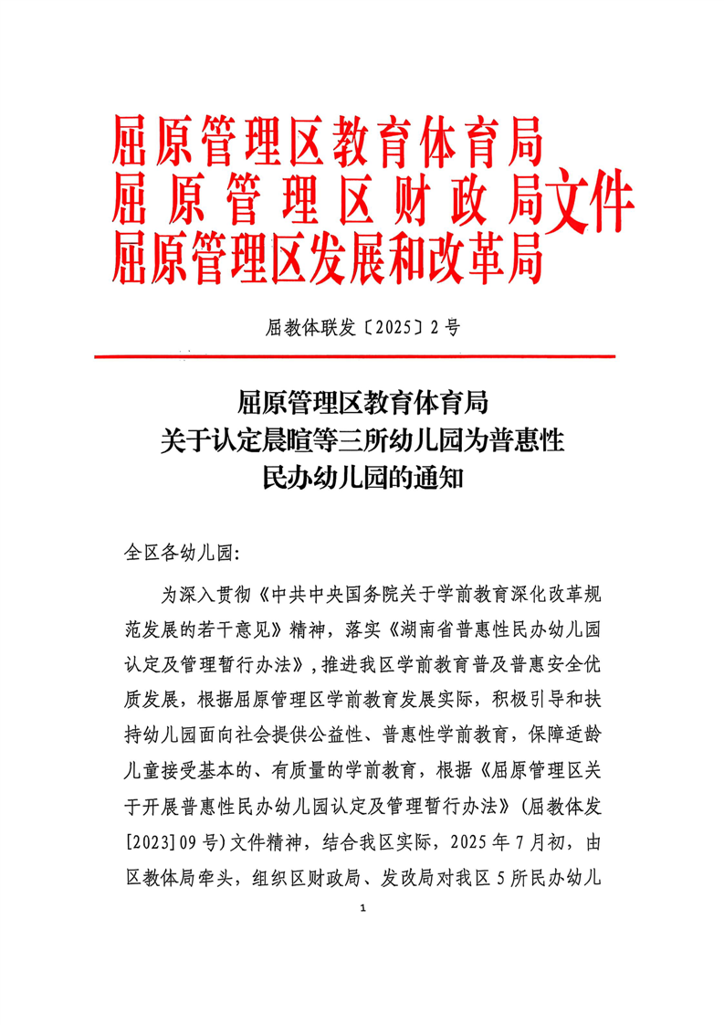 屈原管理区教育体育局关于认定晨暄等三所幼儿园为普惠性民办幼儿园的通知