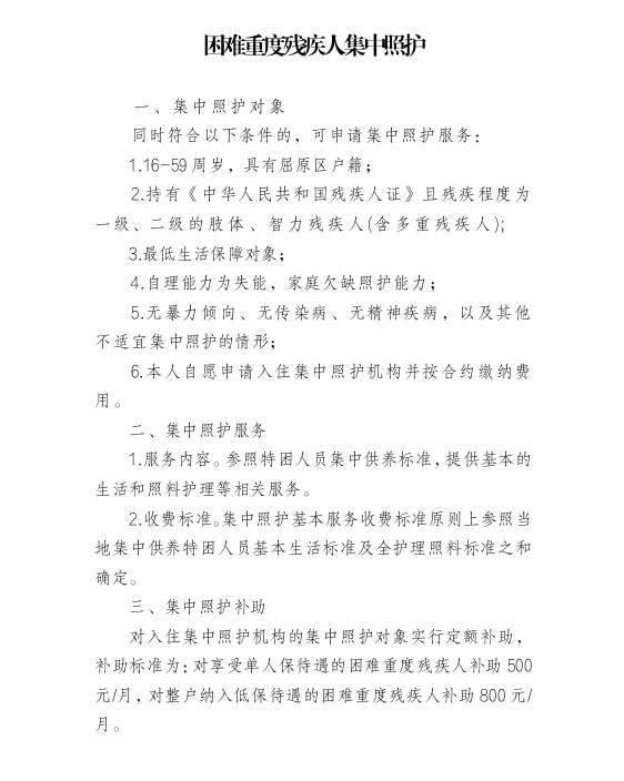 困难重度残疾人集中照护政策
