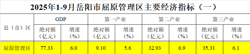 2025年1-9月岳阳市屈原管理区主要经济指标