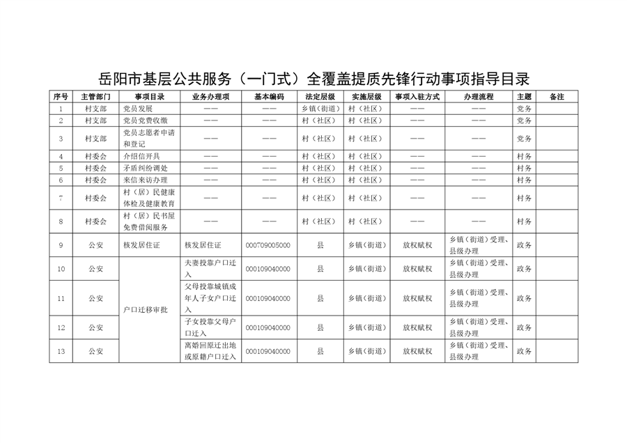 岳阳市基层公共服务(一门式)全覆盖提质先锋行动事项指导目录
