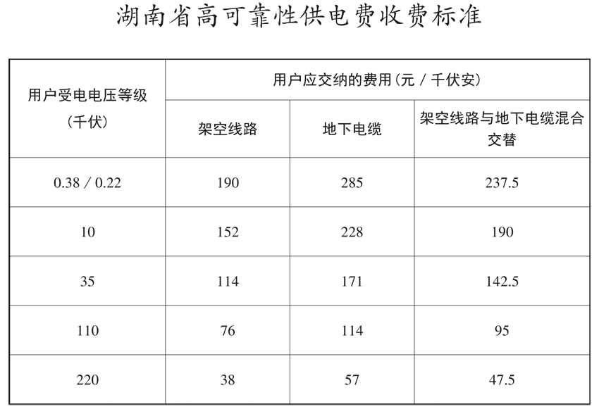 1.电力接入工程由供电企业投资建设至用户建筑区划红线的专变项目,按以下标准收取高可靠性供电费:采用架空线路的,0.38/0.22千伏收费标准为190元/千伏安;10千伏为152元/千伏安;35千伏、110千伏、220千伏分别为114元、76元、38元/千伏安;地下电缆按架空线路标准的1.5倍计收;架空和电缆线路交替混合的,按架空线路的1.25倍计收。具体收费标准详见附件。