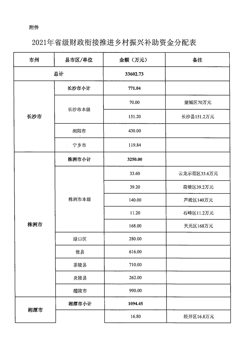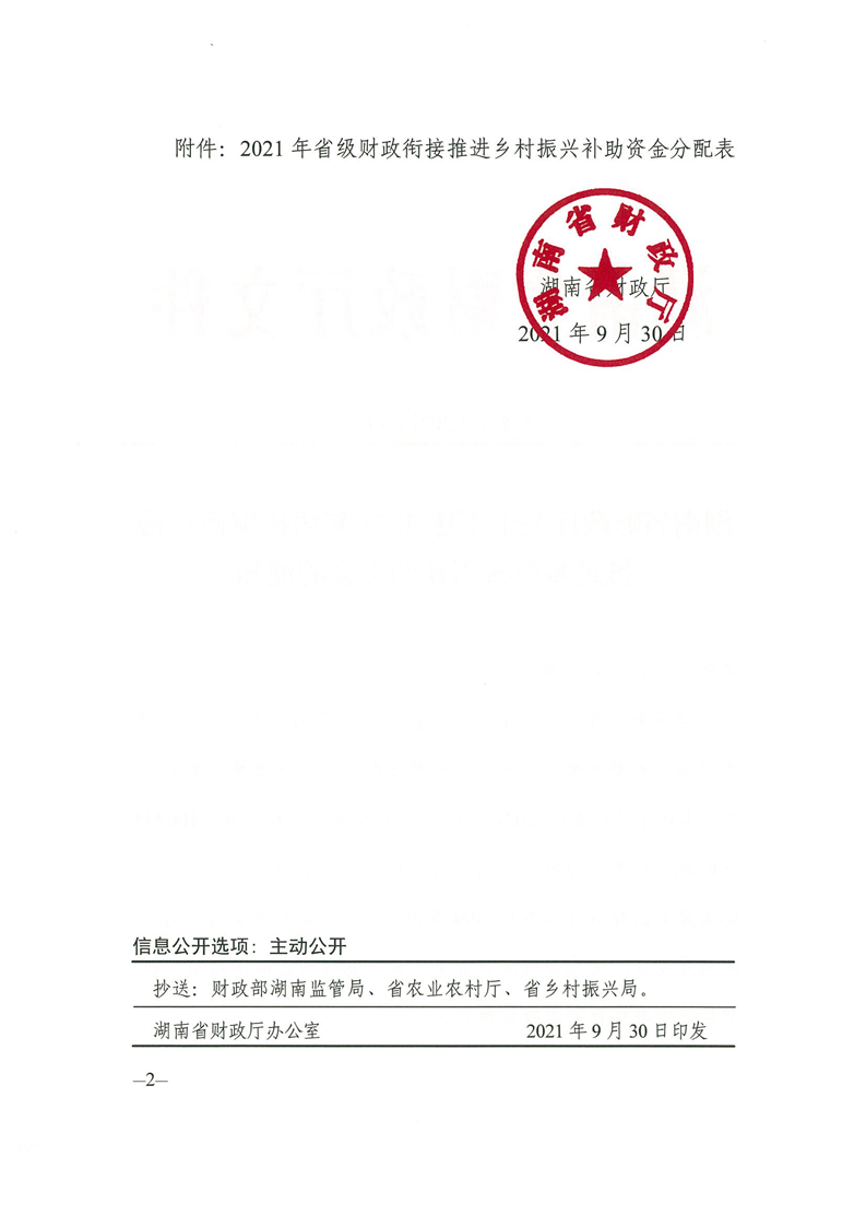 现将《湖南省财政厅关于下达2021年省级财政衔接推进乡村振兴补助资金的通知》予以公示