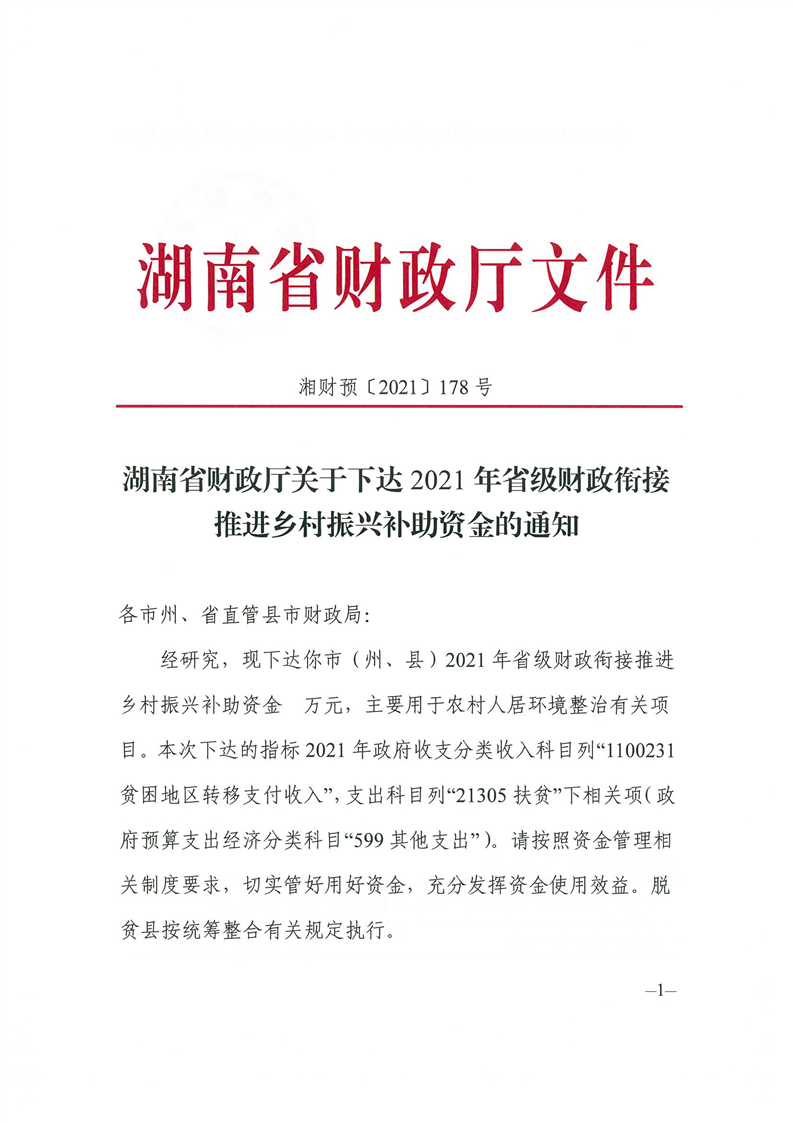 现将《湖南省财政厅关于下达2021年省级财政衔接推进乡村振兴补助资金的通知》予以公示。监督电话:0730-5711962