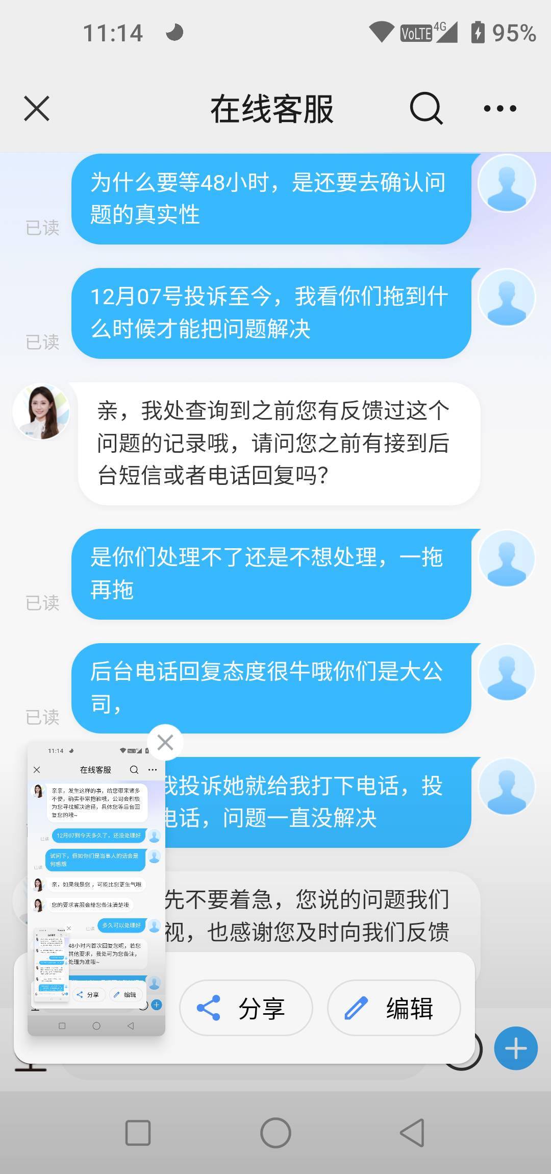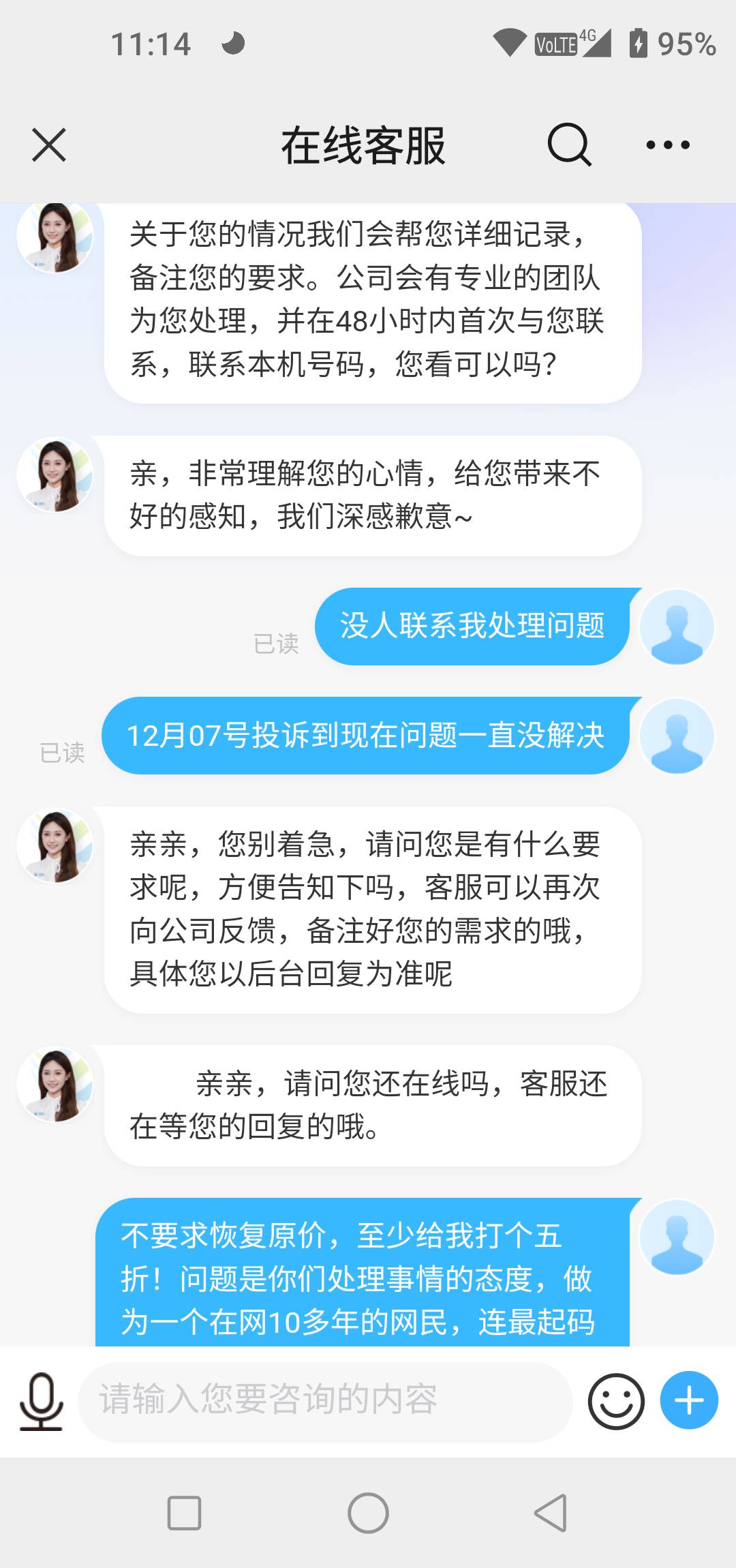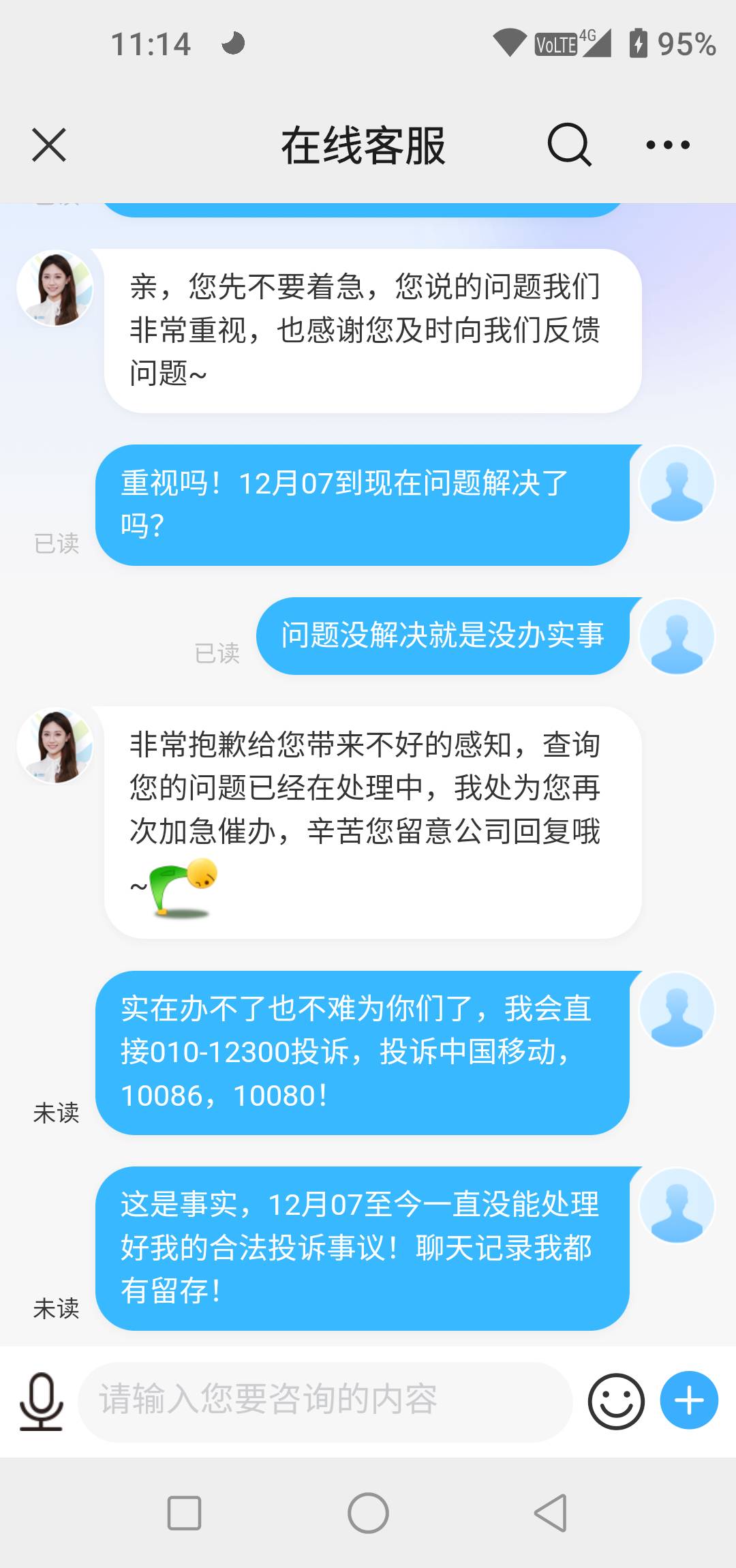 | 内容: | 中国移动单方面停止其套餐优惠活动!原139元套餐享优惠下来一个月只需要39.5元就可以了,中国移动于12月单方面停止其活动并将我的套餐恢复到了原价139,说活动到期没有了,什么活动到期,就妥妥的单方面给我停止优惠了,霸王条款吗本人于12月07号开始向10086投诉此问题至今问题一直没有得到合作的解决!也有投诉至10080,中间有人员联系,但是处理问题的态度和方式方法我很不认可,身为公民连自己最基本的合法权益都不能维护,中国移动这么大的一个企业连一个那么简单的问题都处理不了,莫要让行业人员笑话!希望能妥善及时的把这个问题处理!在网10几年了这点小小的诉求,还望加急处理 |