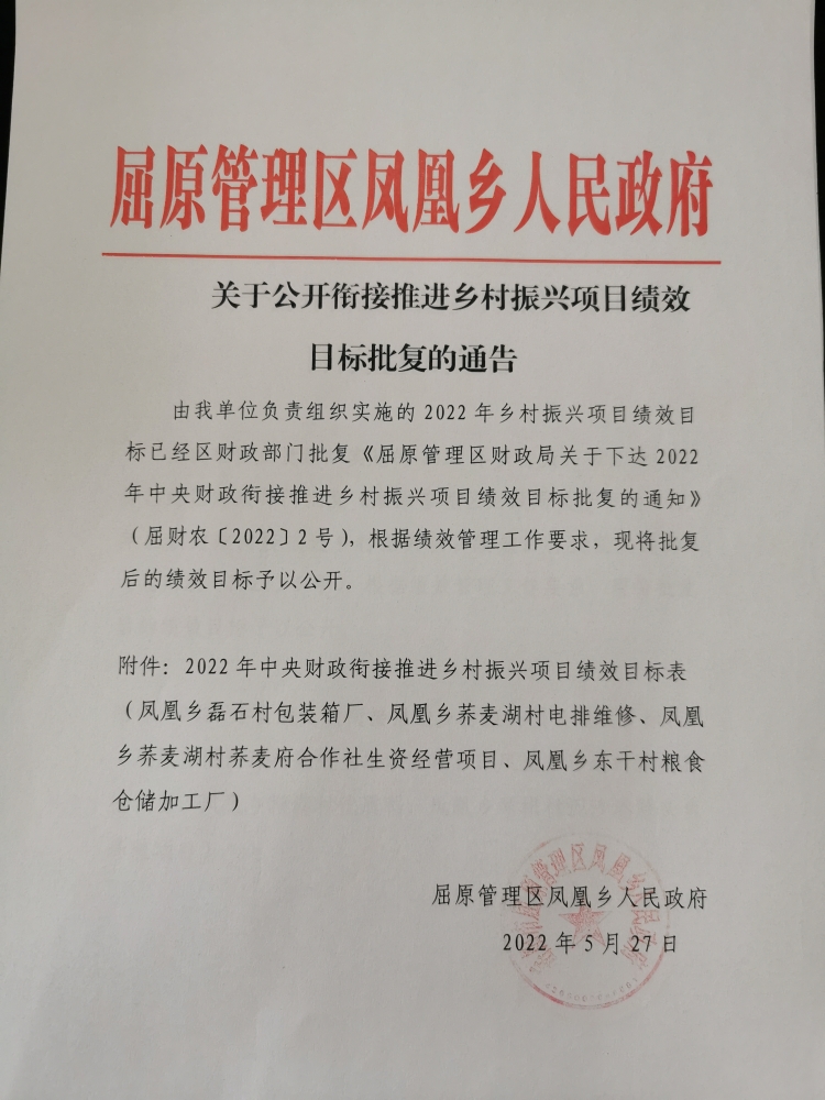 关于公开衔接推进乡村振兴项目绩效目标批复的通告(中央二批 屈振局9号)